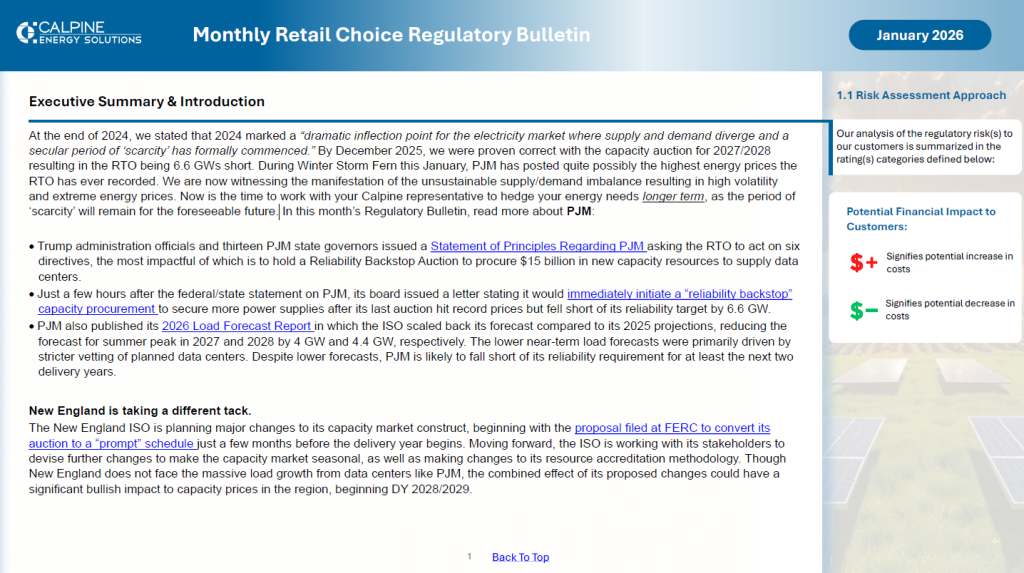 At the end of 2024, we stated that 2024 marked a “dramatic inflection point for the electricity market where supply and demand diverge and a secular period of ‘scarcity’ has formally commenced.” By December 2025, we were proven correct with the capacity auction for 2027/2028 resulting in the RTO being 6.6 GWs short. During Winter Storm Fern this January, PJM has posted quite possibly the highest energy prices the RTO has ever recorded. We are now witnessing the manifestation of the unsustainable supply/demand imbalance resulting in high volatility and extreme energy prices. Now is the time to work with your Calpine representative to hedge your energy needs longer term, as the period of ‘scarcity’ will remain for the foreseeable future.